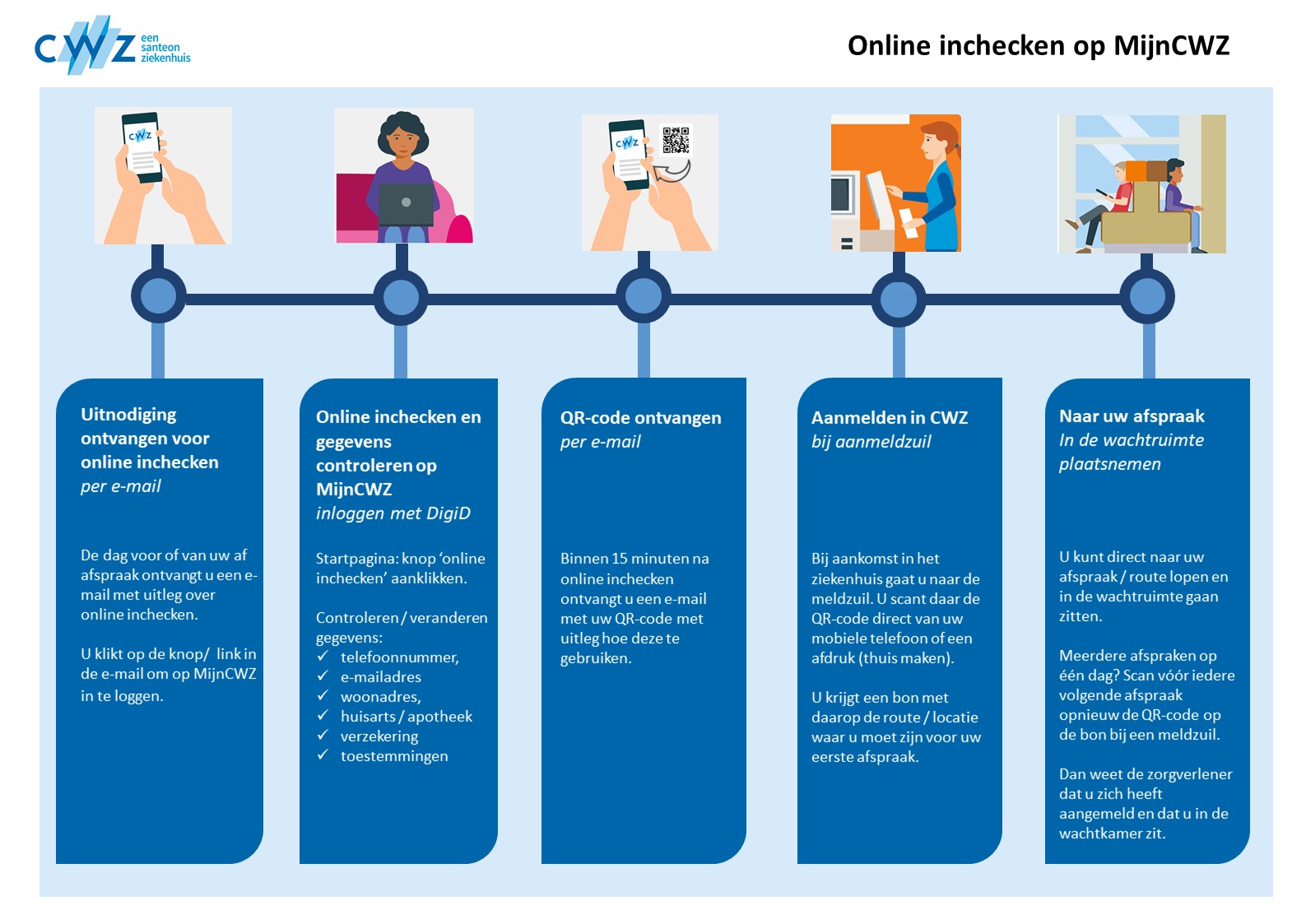 Op MijnCWZ kunt u thuis alvast online inchecken voor uw afspraak. U controleert op MijnCWZ een aantal gegevens en ontvangt daarna een e-mail met een QR-code. Met de QR-code kunt u zich in het ziekenhuis sneller aanmelden bij een meldzuil. Thuis online inchecken is gemakkelijk en bespaart tijd op de dag van uw afspraak!