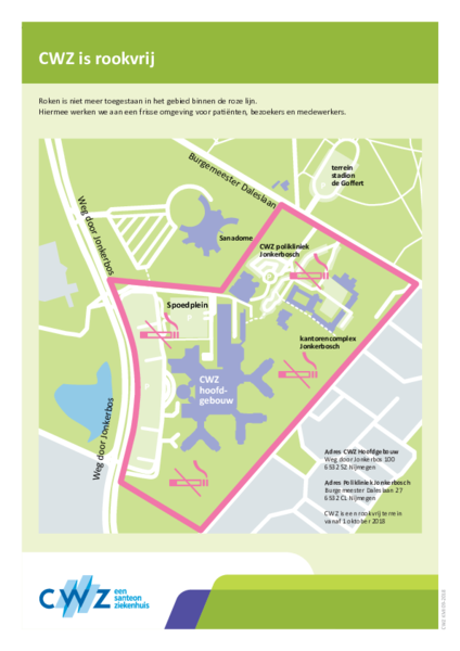 CWZ is rookvrij. Roken is niet toegestaan in het ziekenhuis en ook niet op het terrein van CWZ. Zo werken we aan een frisse omgeving voor onze patiënten, bezoekers en medewerkers.